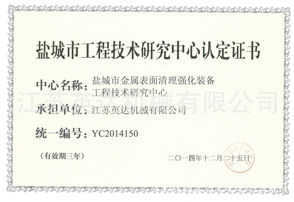 公司率先通过ISO9001:2008质量管理体系认证、ISO14001:2004环境管理体系认证。拥有一支专业的技术团队,先后取得了网带通过式抛丸机、新型机械回收喷砂房、辊道通过式重钢抛丸机等三十项产品专利和10项江苏省高新技术产品。(注:各项产品专利及所有证书详见企业官网:http://www.ydzj.net/或阿里诚信档案)